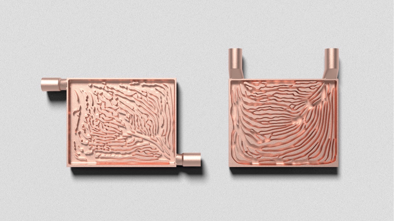 铂力特拓扑优化纯铜冷板将亮相TCT Asia 2026。 数据中心算力功率及能耗的提升,推动了服务器内部结构朝着高功率密度、高效散热的方向发展,同时也对散热系统的设计提出了新的挑战。为适应紧凑架构对散热组件的更高要求,铂力特的产品设计团队基于流动传热拓扑优化方法,以保障换热为前提、降低流阻为主要目标,优化设计了三款耗纯铜冷板,可面向不同的热源布局与工况需求。流道采用立体设计。冷却介质通过外层流道特征,实现进口流量“一分四”设计,使四分之一的流量分别从冷板内的四处导通接口进入内层拓扑流道,于中间位置汇流并流出。在流道内层,基于特征寻优设计可以使整个流道在保证换热性能的同时,将流阻维持在较低水平,有助于减小冷板表面温差,提升温度分布的均匀性。此外,在工程经验的基础上,设计团队进一步优化芯体各细节特征,巩固整体换热效率的同时使零件具备良好的工艺适应性。