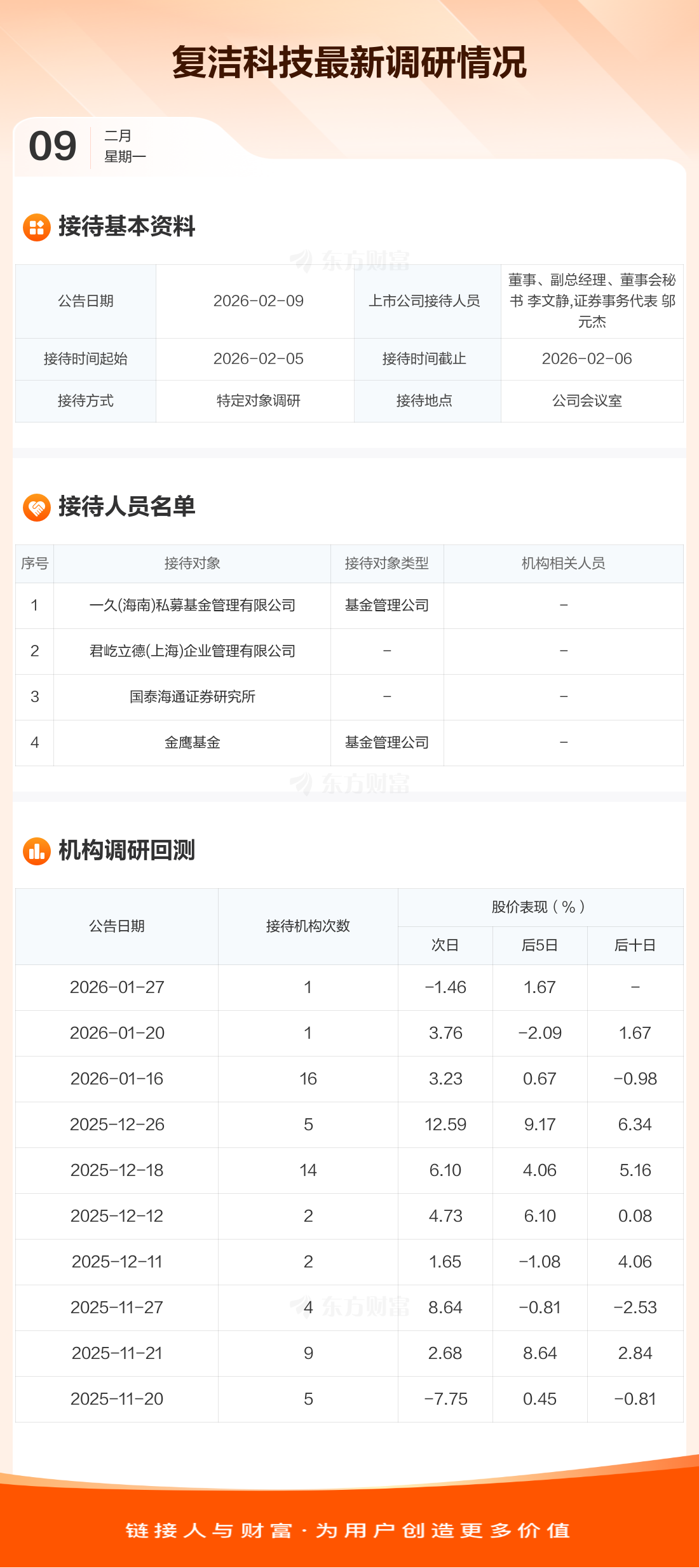 复洁科技2月9日公告称,2月5日至2月6日接待一久(海南)私募基金管理有限公司等4家机构调研。接待人员包括董事、副总经理、董事会秘书 李文静,证券事务代表 邬元杰。