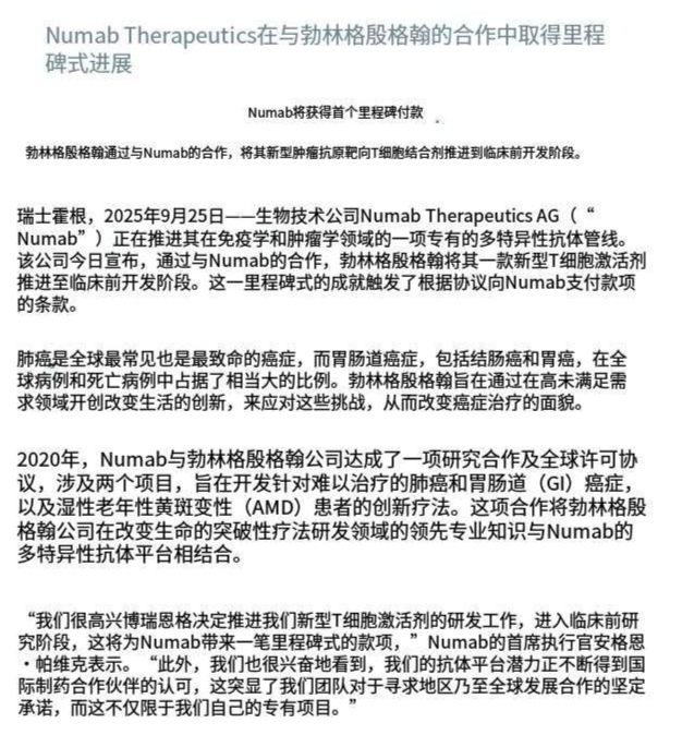 Numab Therapeutics与勃林格殷格翰合作实现里程碑