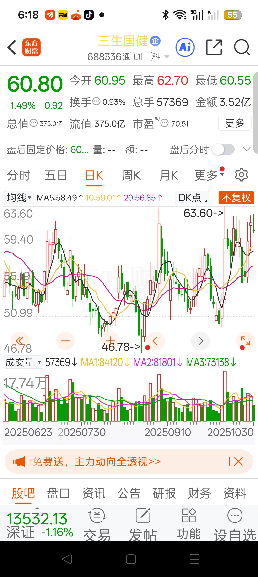 三生国健今天盘中又摸高点,60元上方立稳,从K线图上看,由于挖坑形成的54.83元~60.80元差价约6元,明日5天线自然上穿10天线,形成标准的多头姿态。