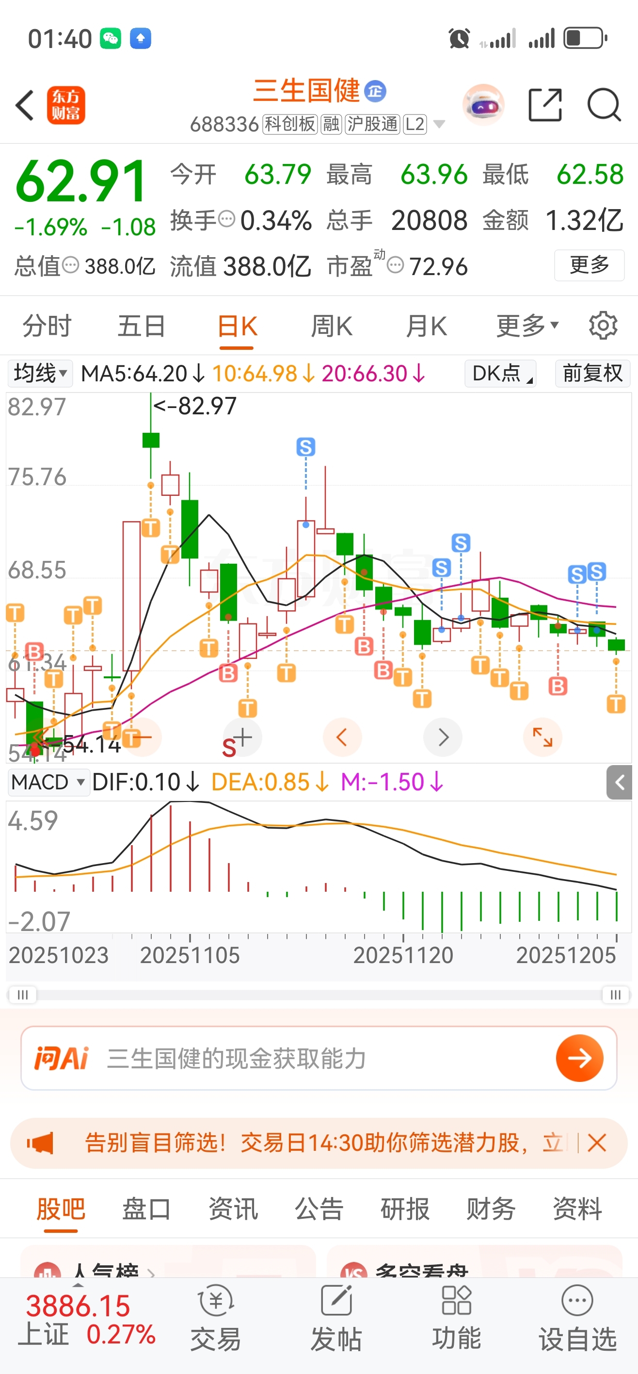 $三生国健(SH688336)$ 股市里就是最好的人性博弈,这股从25到63我只留赚的钱,波段操作反复T+0又将赚的股做到负数,又从83到63,从云端仰望星空,又从星空领略海上明月湖光山色,真的是除了灵感必须反人性操作