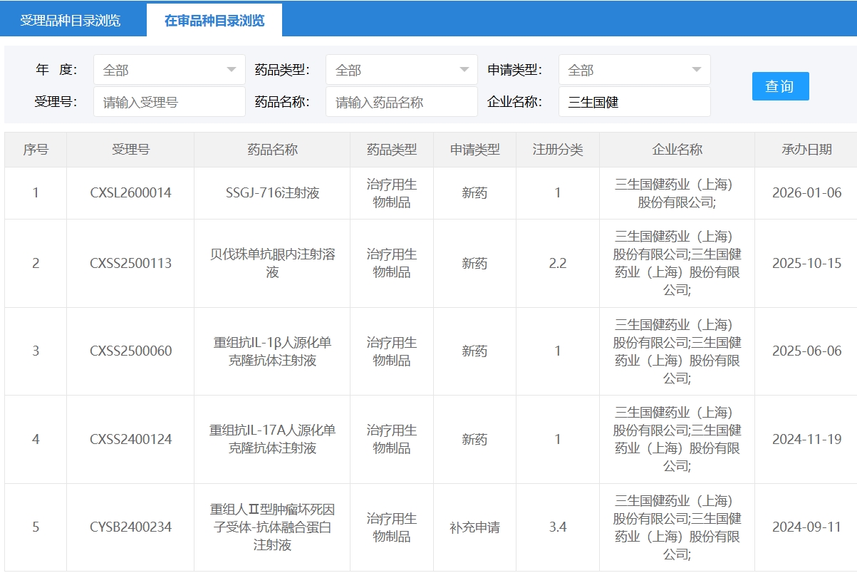 国家药品监督管理局药品审评中心在审品种目录(三生国健)