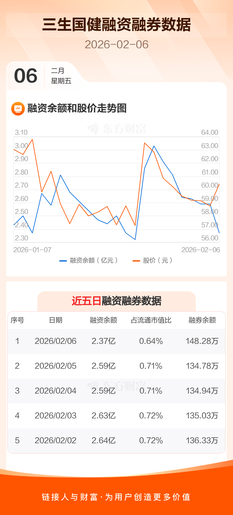 交易所最新数据显示,三生国健于2026年2月6日获融资买入3531.92万元,融资偿还5742.44万元,当日融资净偿还2210.52万元。目前,该股融资余额2.37亿,占流通市值比例为0.64%。