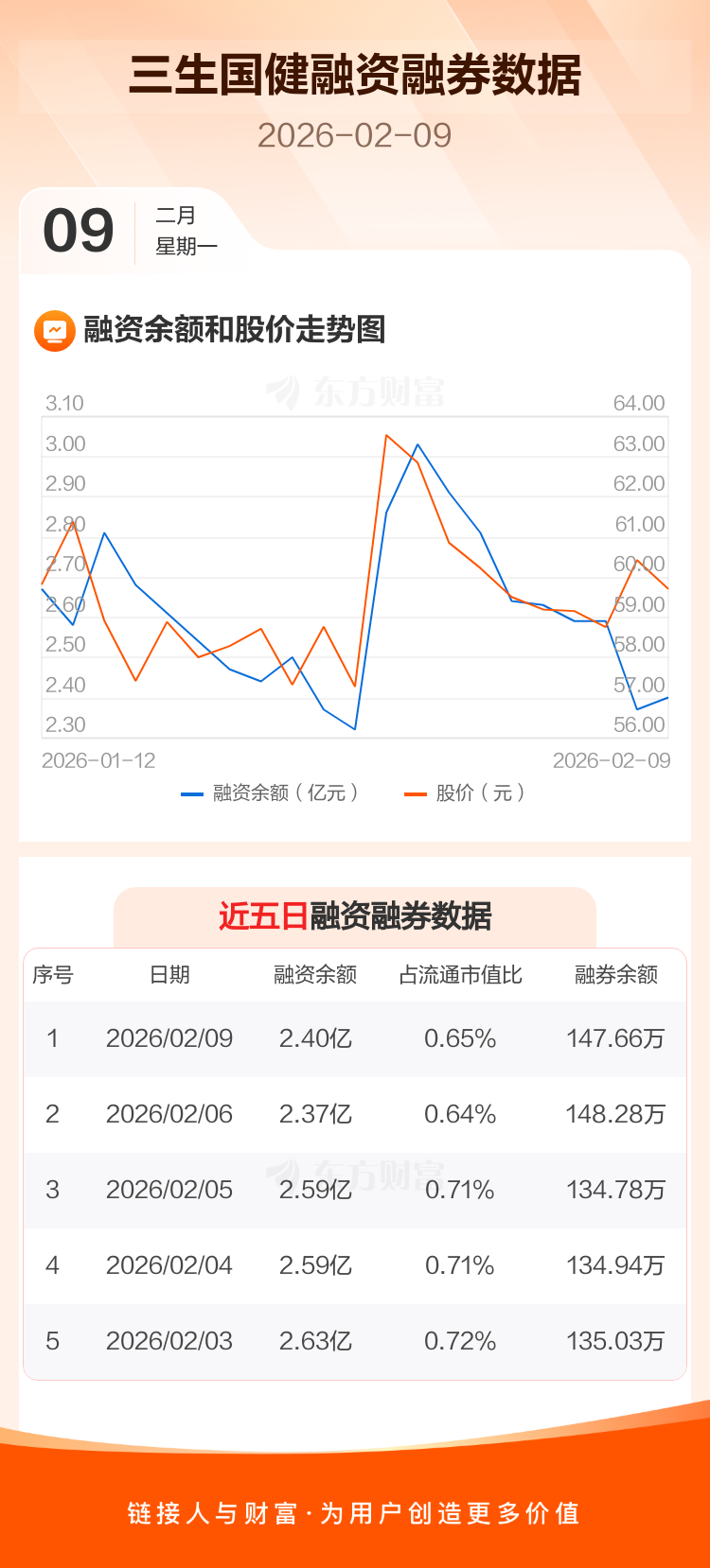 交易所最新数据显示,三生国健于2026年2月9日获融资买入3158.63万元,融资偿还2846.86万元,当日融资净买入311.76万元。目前,该股融资余额2.40亿,占流通市值比例为0.65%。