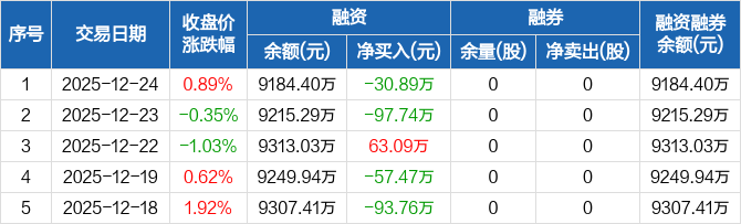 赛科希德:融资净偿还30.89万元,融资余额9184.4万元(12-24)