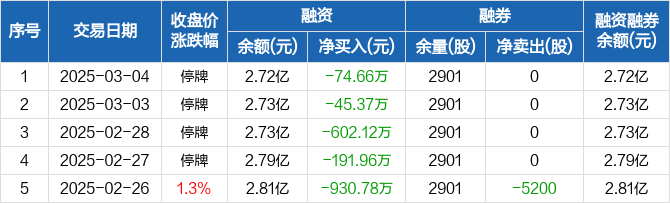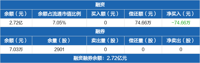 融资方面,当日融资买入0元,融资偿还74.66万元,融资净偿还74.66万元,连续5日净偿还累计1844.89万元。融券方面,融券卖出0股,融券偿还0股,融券余量2901股,融券余额7.03万元。融资融券余额合计2.72亿元。