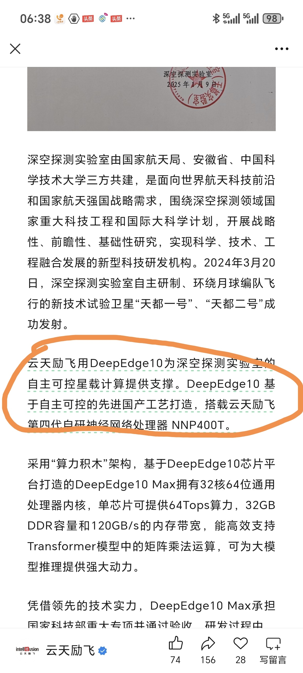 $云天励飞-U(SH688343)$ 未来的竞争在太空,太空AI算力争霸赛即将打响,谁才是真正有自主可控核心技术的芯片公司一目了然,太空算力云天励飞早有布局,是金子早晚要发光,大家要擦亮眼睛。云天励飞,我看股价迟早要往太空飞。