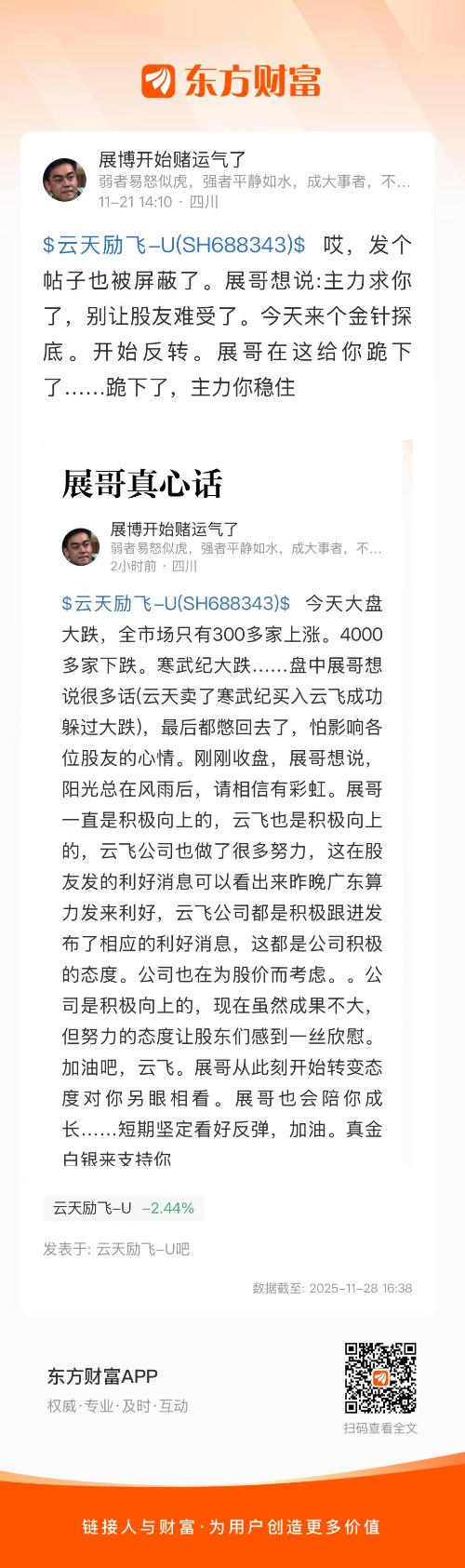 $云天励飞-U(SH688343)$ 哎,发个帖子也被屏蔽了。展哥想说:主力求你了,别让股友难受了。今天来个金针探底。开始反转。展哥在这给你跪下了……跪下了,主力你稳住