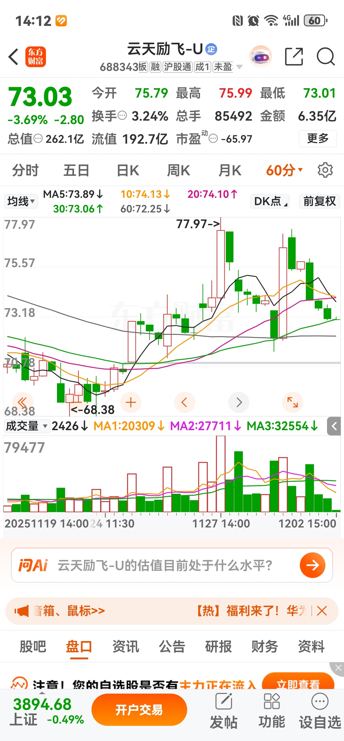$云天励飞-U(SH688343)$ 60分钟线标准的M头。