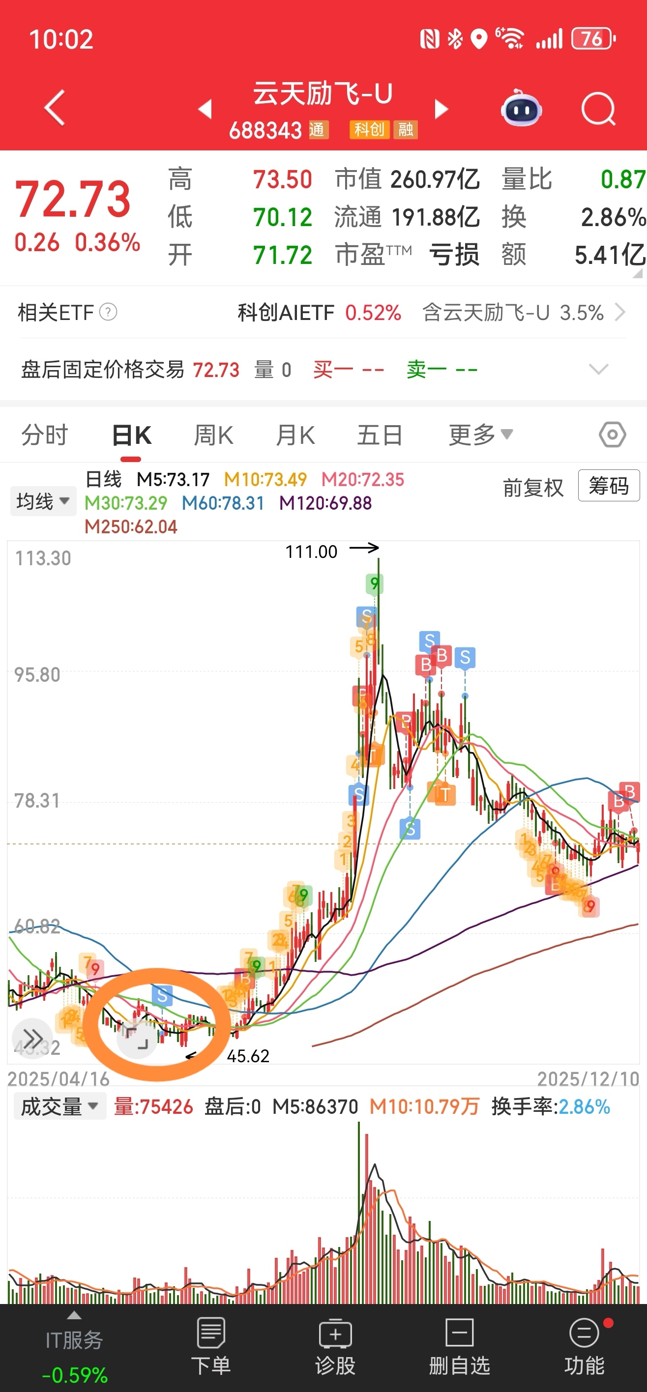 $云天励飞-U(SH688343)$ 云天现在的位置,参考画圈位,股价从下跌趋势转到震荡盘底区,起码还得2周盘整。有耐心的70以下慢慢买,忽视短期上跳下串。有技术的,做做T。云天浪型非常清晰,这里就是底部区域,筑底最磨人,不排除主力再挖坑,耐心耐心再耐心。谩骂骂不起股价,吹嘘也拉不起股价,摩尔把AI芯片的市值打到了新高度,静等风起!!!