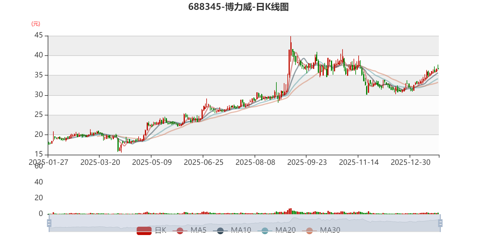中证智能财讯博力威(688345)1月26日晚间披露2025年度业绩预告,预计2025年归母净利润5900万元,上年同期亏损9660.78万元;扣非净利润预计4100万元,上年同期亏损8442.19万元。以1月26日收盘价计算,博力威目前市盈率(TTM)约为62.82倍,市净率(LF)约3.36倍,市销率(TTM)约1.4倍。