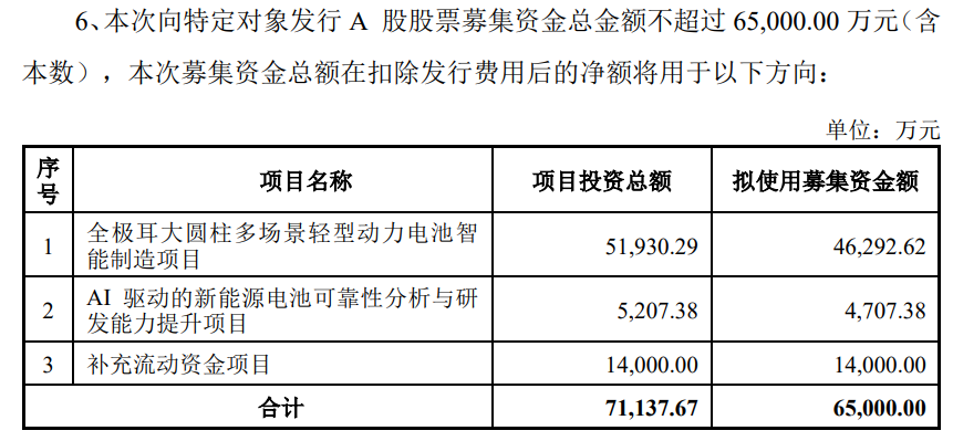 本次发行的背景和目的方面,申报稿显示,锂电池作为能量存储的核心载体,其应用边界正从传统消费电子、新能源汽车、储能电站到加速渗透两轮车、船舶、工程机械等场景,目前正逐步向低空经济、具身智能机器人、BBU等新兴业态延伸。近年来,国家政策持续发力,为新能源锂电池及下游轻型车、机器人等行业高质量发展提供有力保障。