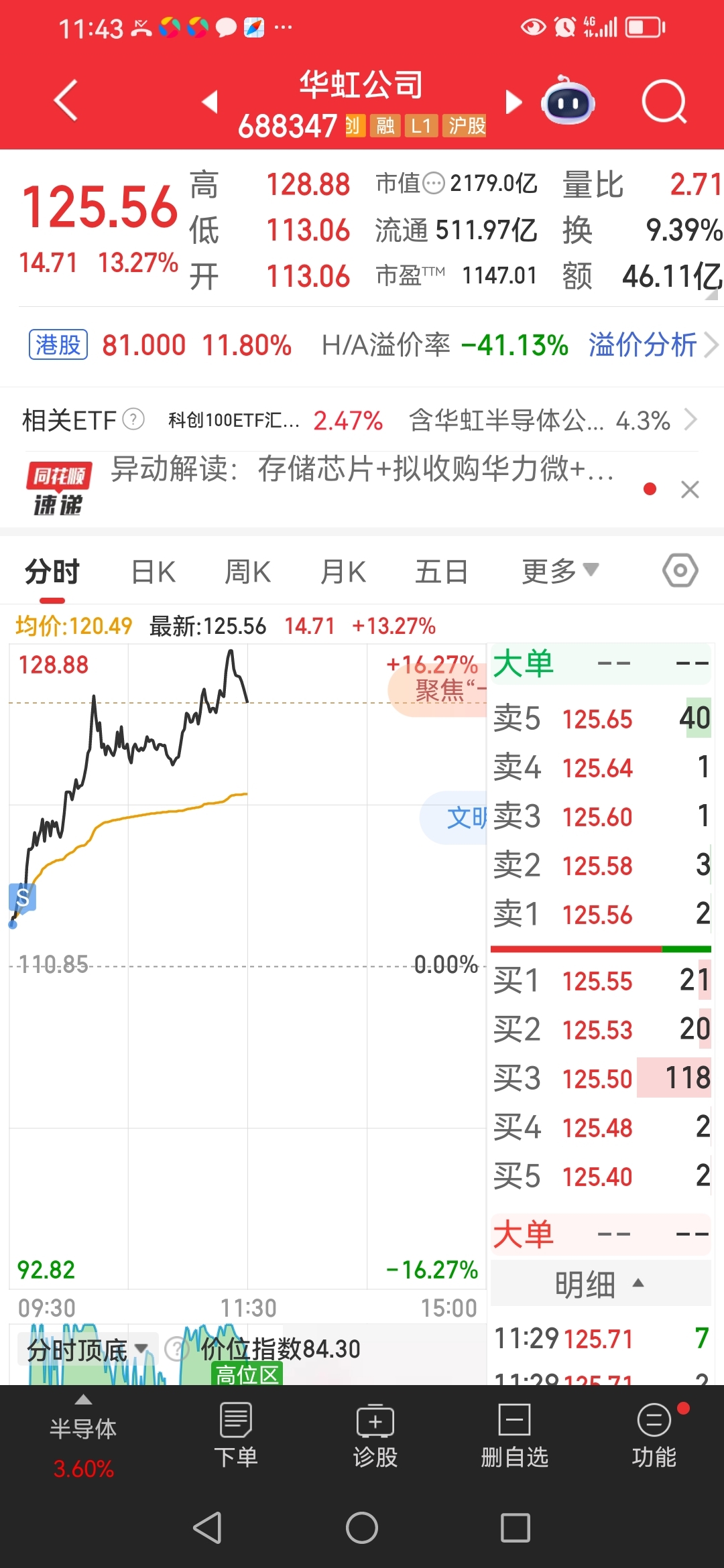 华虹大涨,心中难受了。。。虽然是109.1买的,为什么会那么着急。