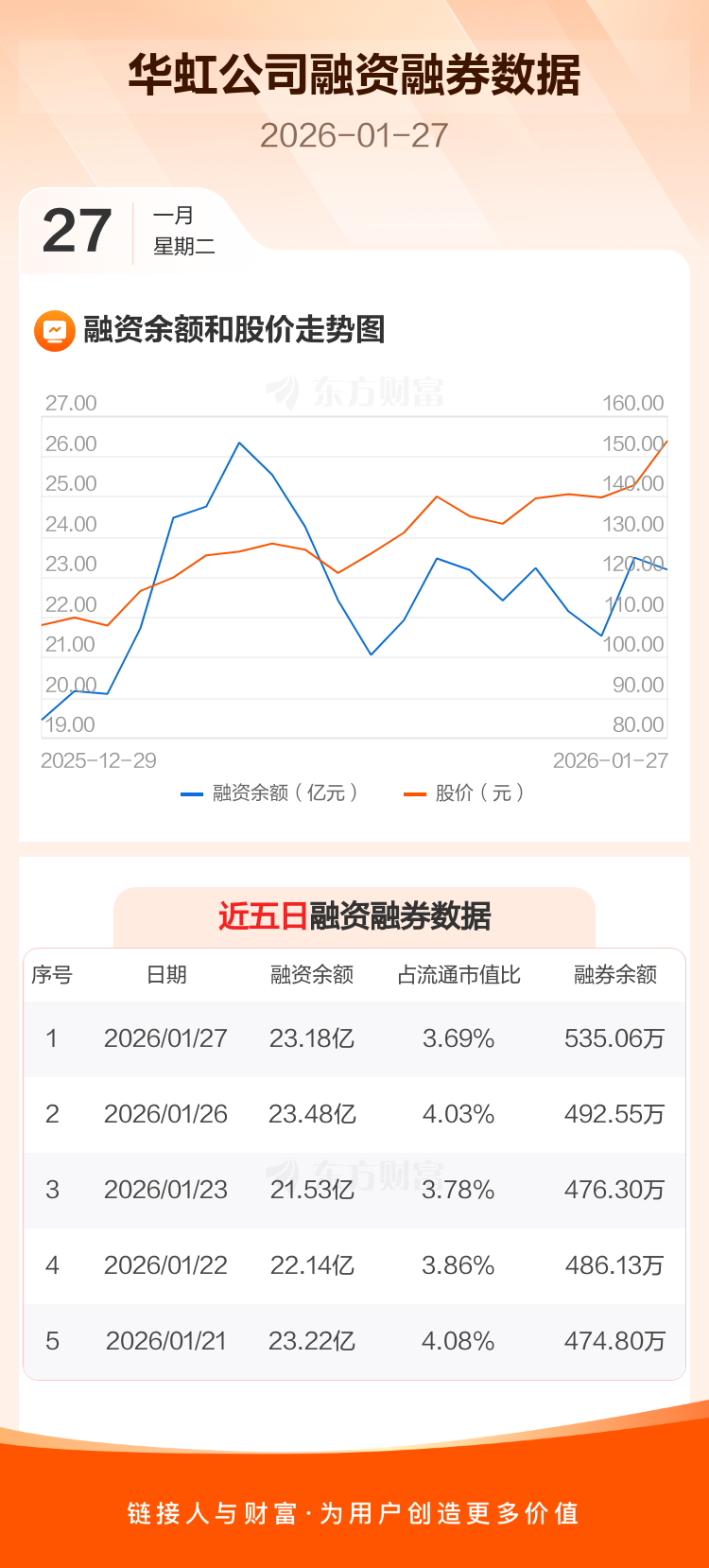 交易所最新数据显示,华虹公司于2026年1月27日获融资买入3.67亿元,融资偿还3.97亿元,当日融资净偿还2973.45万元。目前,该股融资余额23.18亿,占流通市值比例为3.69%。