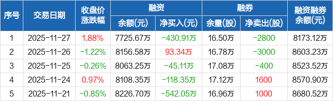 三一重能:融资净偿还430.91万元,融资余额7725.67万元(11-27)