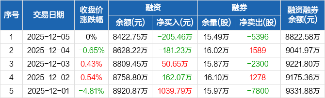 三一重能:融资净偿还205.46万元,融资余额8422.75万元(12-05)