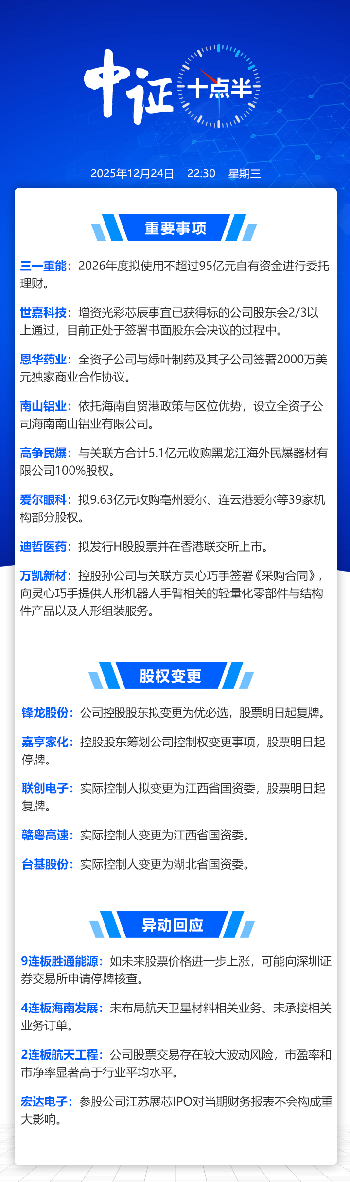 【中证十点半】三一重能拟不超95亿元自有资金进行委托理财;锋龙股份控股股东拟变更为优必选 明起复牌