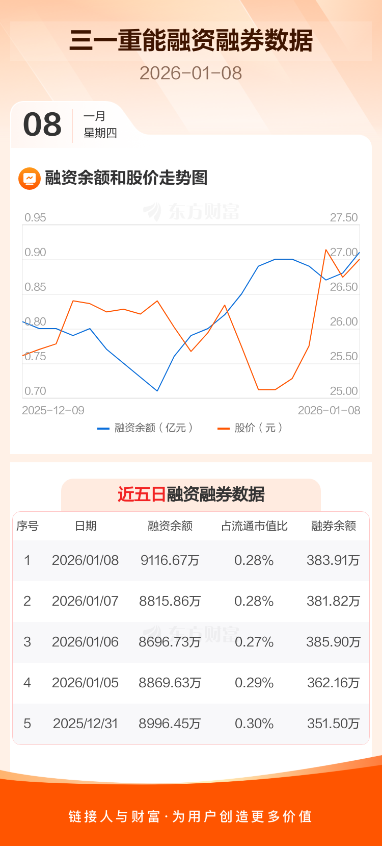 交易所最新数据显示,三一重能于2026年1月8日获融资买入643.22万元,融资偿还342.40万元,当日融资净买入300.82万元。目前,该股融资余额9116.67万,占流通市值比例为0.28%。