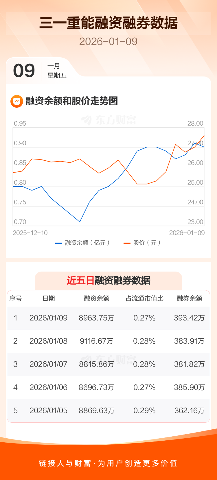 交易所最新数据显示,三一重能于2026年1月9日获融资买入999.31万元,融资偿还1152.24万元,当日融资净偿还152.93万元。目前,该股融资余额8963.75万,占流通市值比例为0.27%。