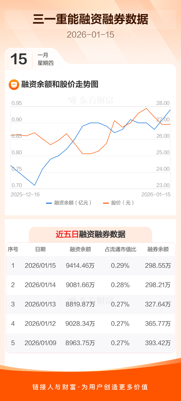 交易所最新数据显示,三一重能于2026年1月15日获融资买入1029.85万元,融资偿还697.04万元,当日融资净买入332.8万元。目前,该股融资余额9414.46万,占流通市值比例为0.29%。