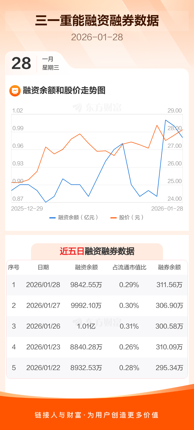 交易所最新数据显示,三一重能于2026年1月28日获融资买入824.58万元,融资偿还974.13万元,当日融资净偿还149.55万元。目前,该股融资余额9842.55万,占流通市值比例为0.29%。