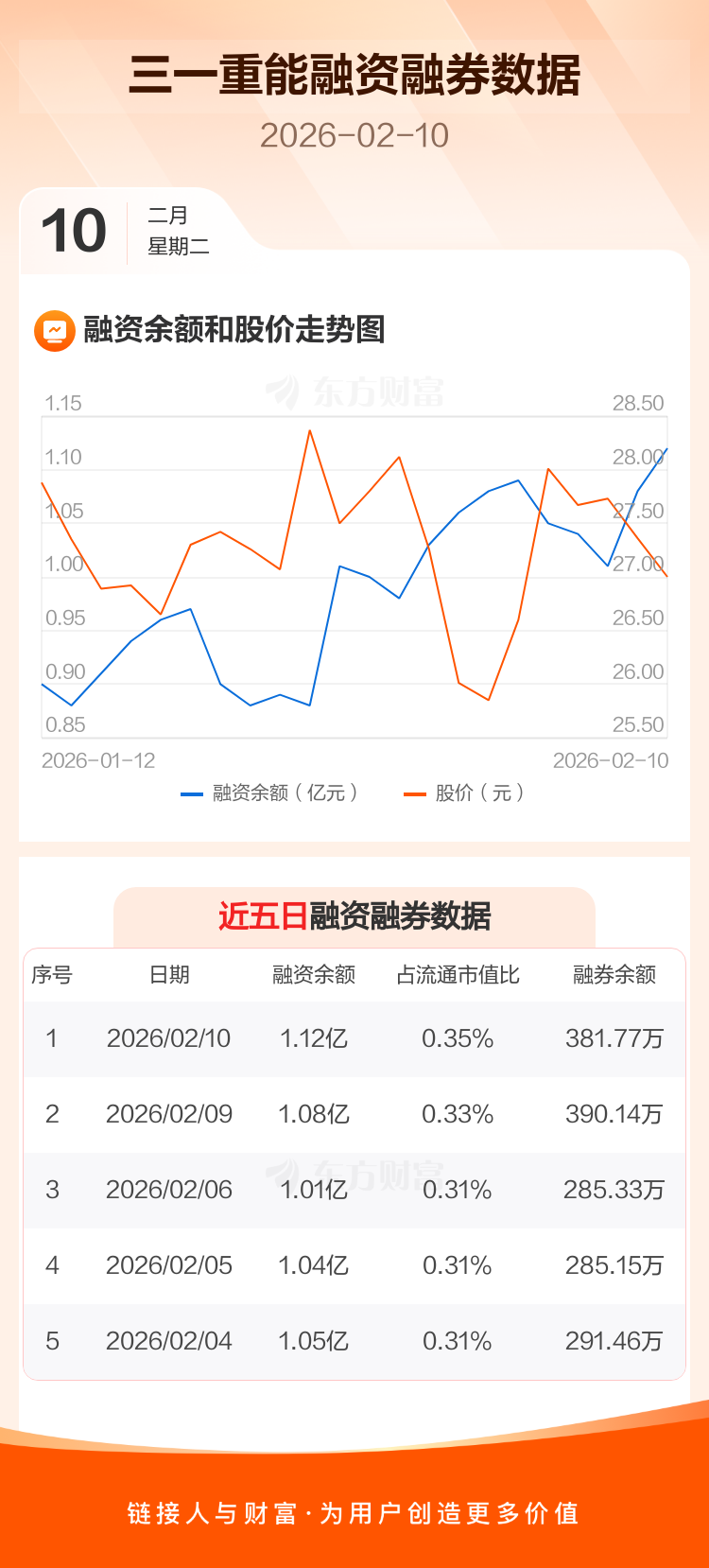 交易所最新数据显示,三一重能于2026年2月10日获融资买入922.81万元,融资偿还558.75万元,当日融资净买入364.06万元。目前,该股融资余额1.12亿,占流通市值比例为0.35%。