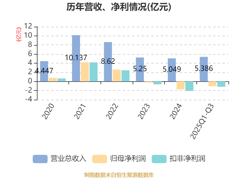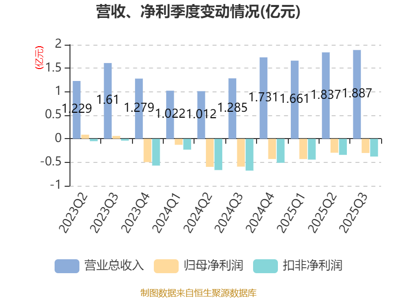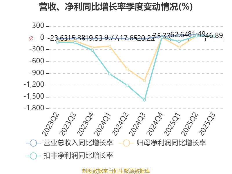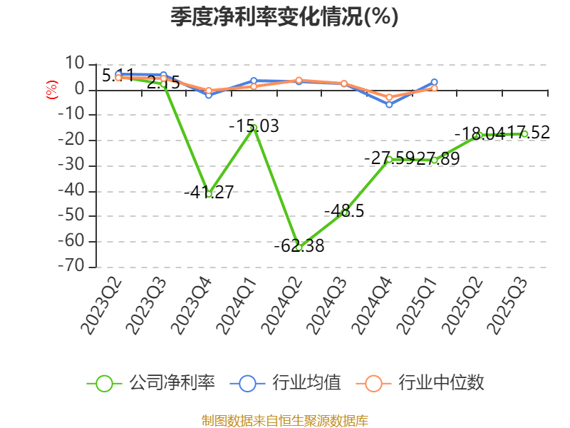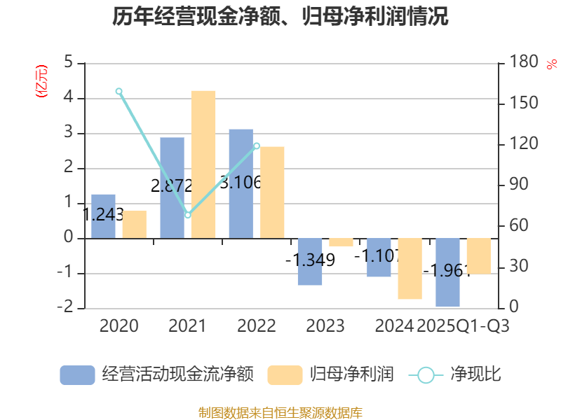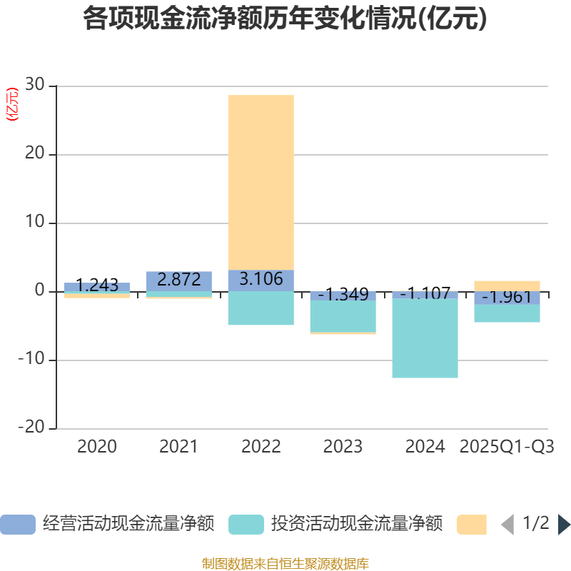2025年前三季度,公司经营活动现金流净额为-1.96亿元,同比减少1.04亿元;筹资活动现金流净额1.49亿元,同比增加1.1亿元;投资活动现金流净额-2.57亿元,上年同期为-16.34亿元。