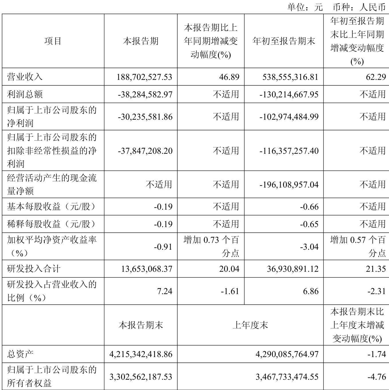 中证智能财讯华盛锂电(688353)10月27日披露2025年第三季度报告。前三季度公司实现营业总收入5.39亿元,同比增长62.29%;归母净利润亏损1.03亿元,上年同期亏损1.32亿元;扣非净利润亏损1.16亿元,上年同期亏损1.57亿元;经营活动产生的现金流量净额为-1.96亿元,上年同期为-9228.98万元;报告期内,华盛锂电基本每股收益为-0.66元,加权平均净资产收益率为-3.04%。
