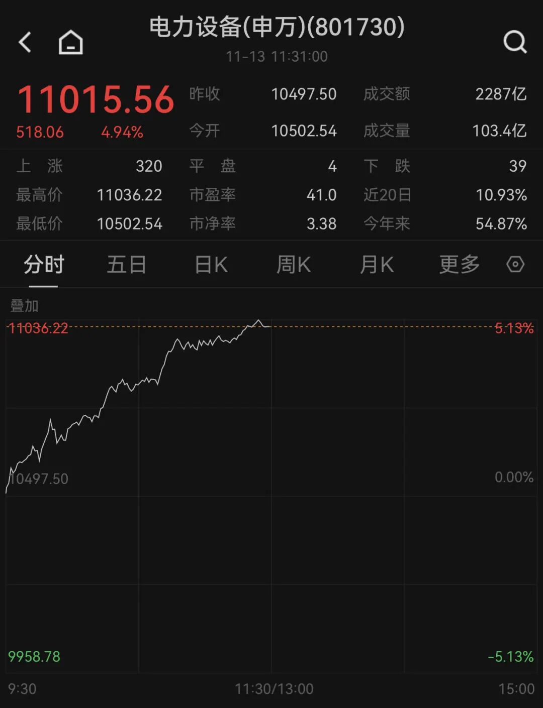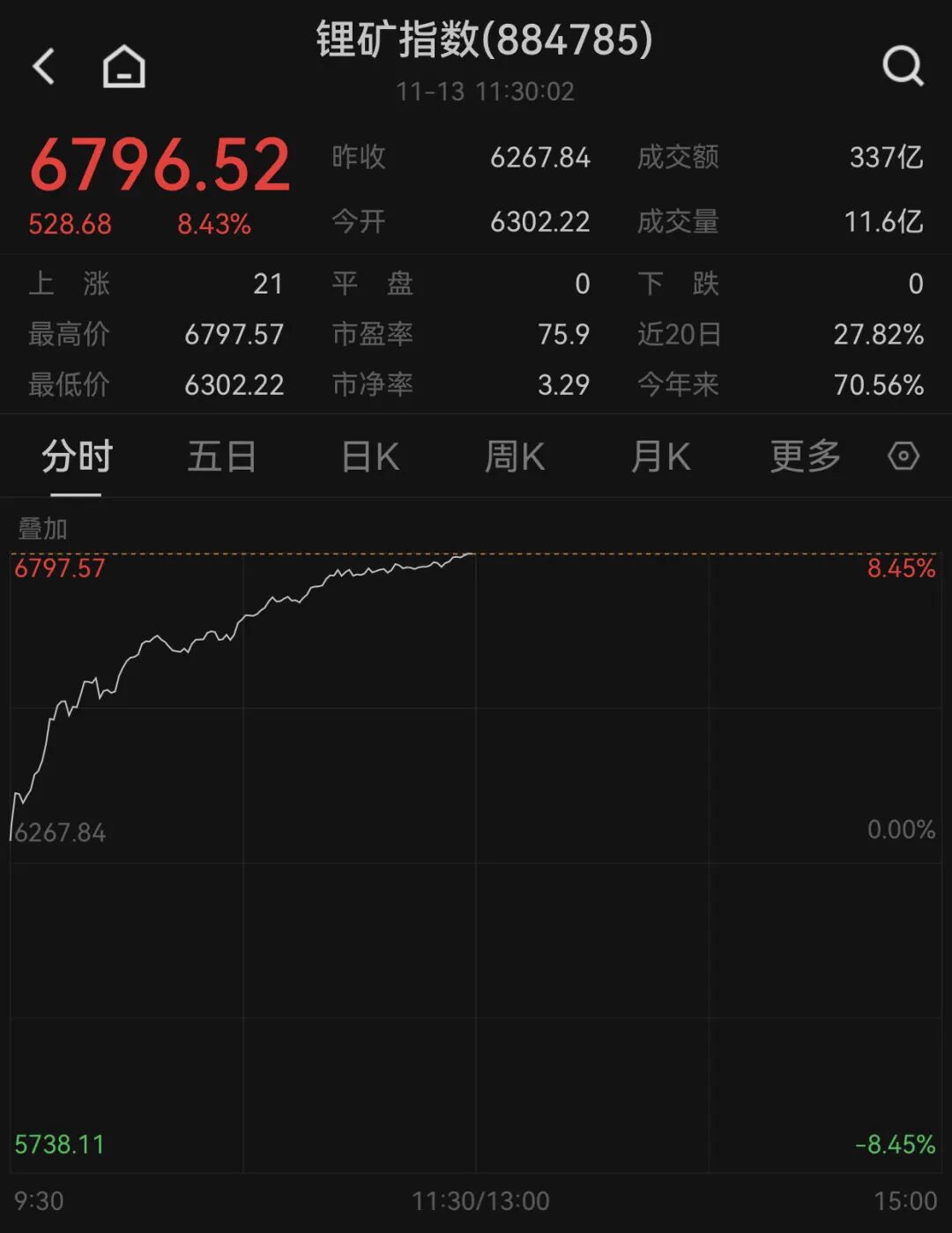 A股市场今天(11月13日)上午整体表现较好,主要指数不同程度上涨。电力设备板块和锂矿概念板块大涨,成为上午A股市场主要亮点。