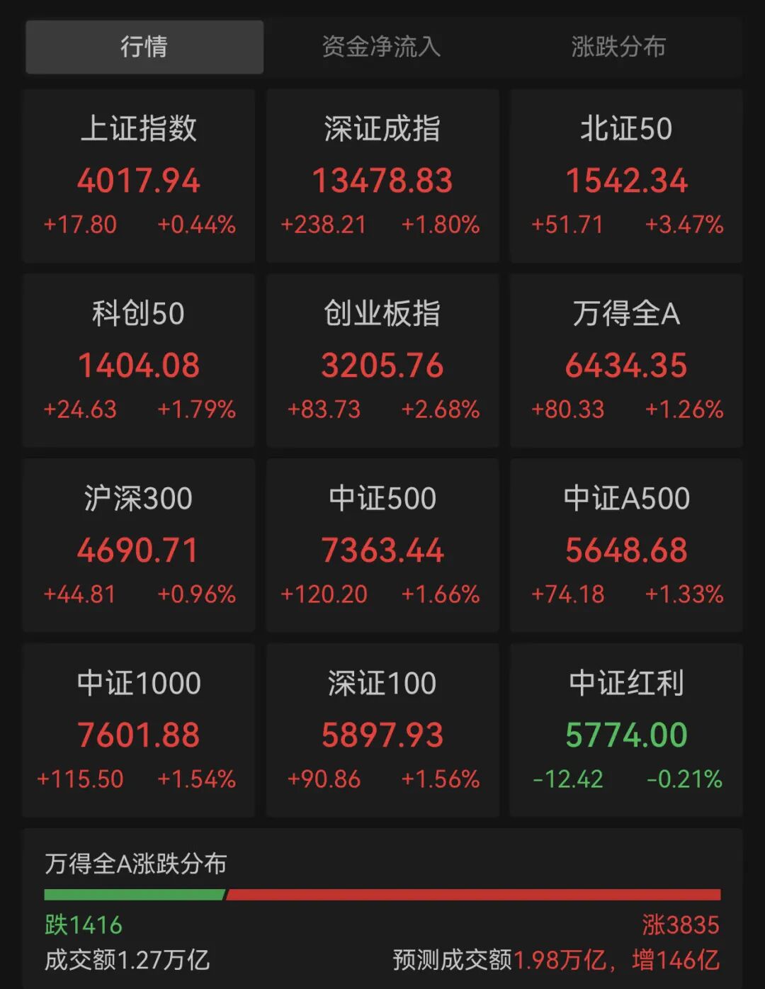 A股市场今天上午整体表现较好,主要指数不同程度上涨,截至中午收盘,上证指数上涨0.44%,深证成指上涨1.8%,创业板指上涨2.68%,科创50指数上涨1.79%,北证50指数上涨3.47%。