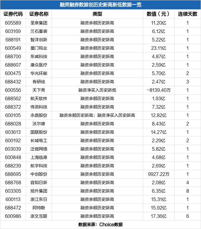 11月13日沪深两市共有142只股票两融数据创历史新高/新低,部分数据如下: