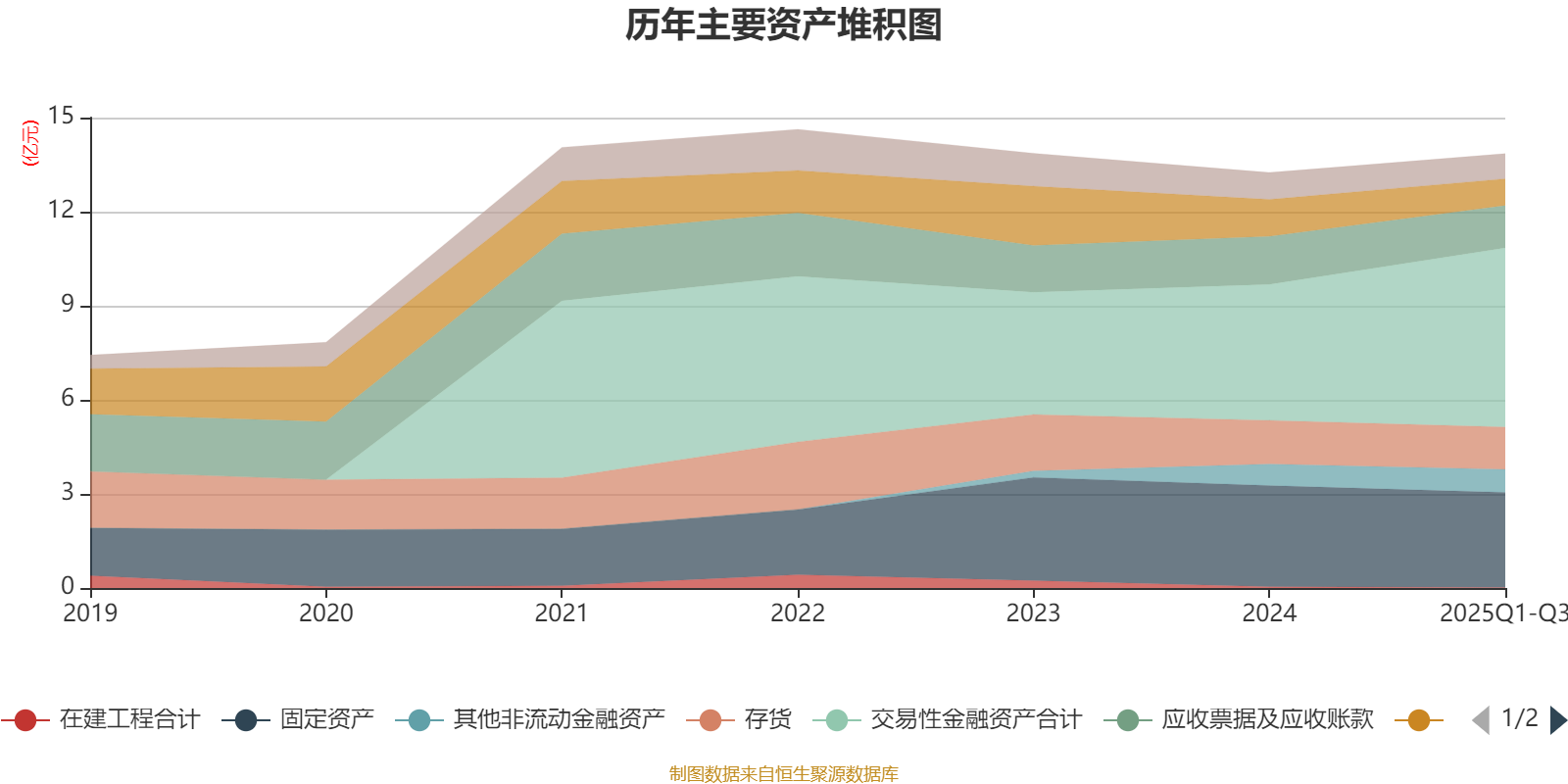 资产重大变化方面,截至2025年三季度末,公司交易性金融资产合计较上年末增加31.78%,占公司总资产比重上升8.51个百分点;货币资金较上年末减少27.51%,占公司总资产比重下降2.73个百分点;固定资产较上年末减少5.99%,占公司总资产比重下降2.46个百分点;应收票据及应收账款较上年末减少11.68%,占公司总资产比重下降1.8个百分点。