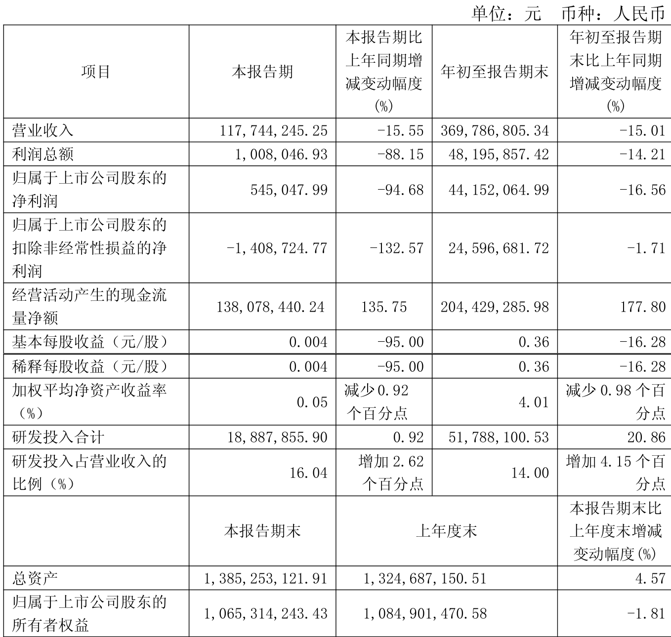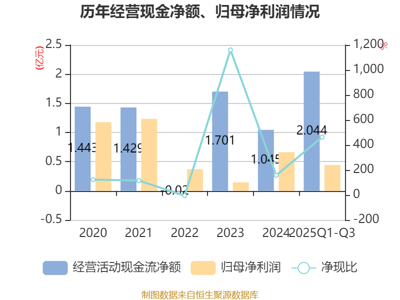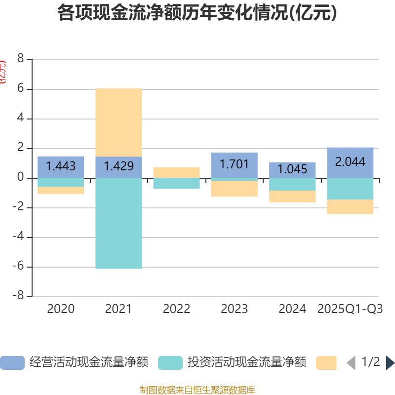 2025年前三季度,公司经营活动现金流净额为2.04亿元,同比增长177.8%;筹资活动现金流净额-9640.78万元,同比减少1699.18万元;投资活动现金流净额-1.48亿元,上年同期为-7052.38万元。