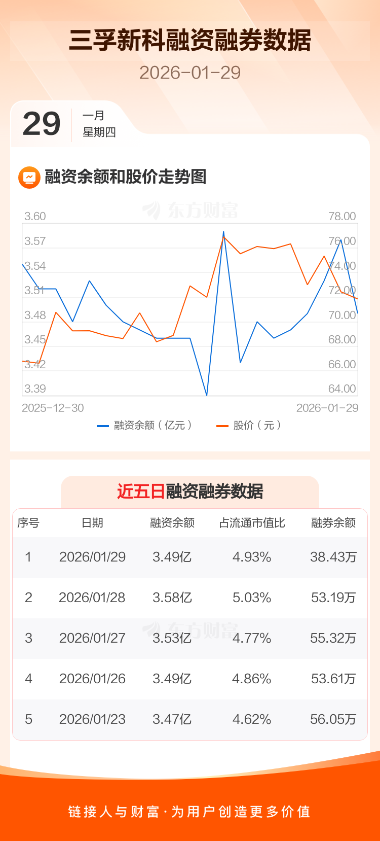 交易所最新数据显示,三孚新科于2026年1月29日获融资买入1277.49万元,融资偿还2269.18万元,当日融资净偿还991.69万元。目前,该股融资余额3.49亿,占流通市值比例为4.93%。