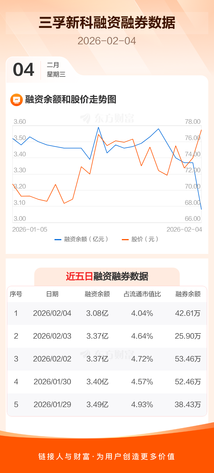 交易所最新数据显示,三孚新科于2026年2月4日获融资买入3317.87万元,融资偿还6281.42万元,当日融资净偿还2963.55万元。目前,该股融资余额3.08亿,占流通市值比例为4.04%。