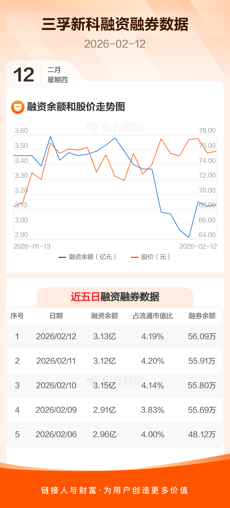 交易所最新数据显示,三孚新科于2026年2月12日获融资买入2228.48万元,融资偿还2192.81万元,当日融资净买入35.66万元。目前,该股融资余额3.13亿,占流通市值比例为4.19%。