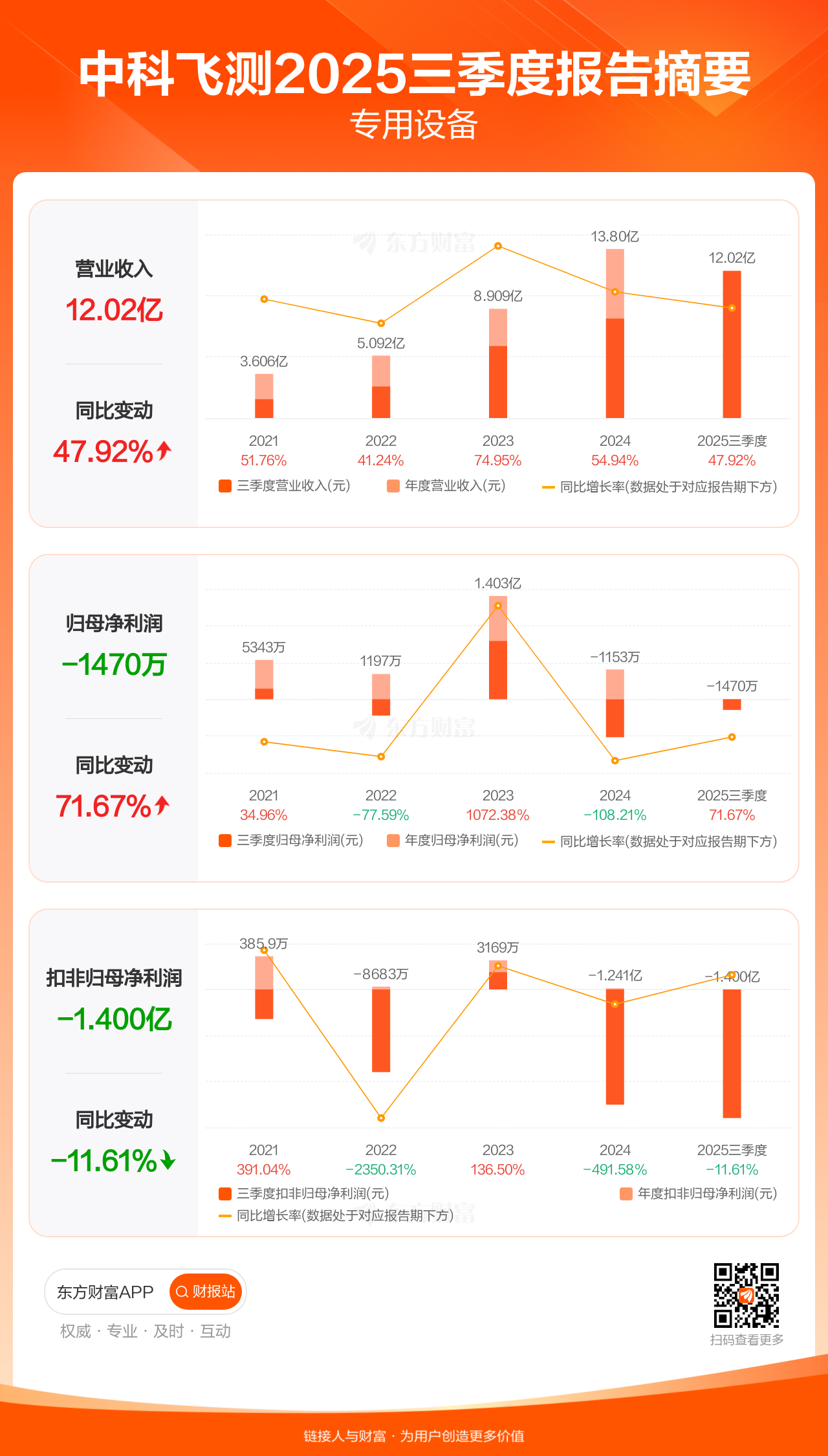 中科飞测10月31日发布2025年三季报显示,公司前三季实现营业收入12.02亿元,同比增长47.92%;归母净利润-1469.85万元;扣非归母净利润-1.40亿元。