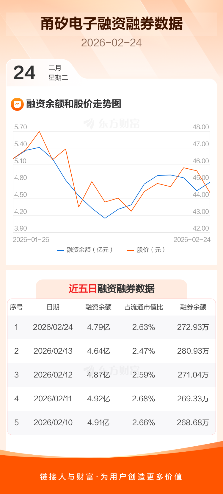 交易所最新数据显示,甬矽电子于2026年2月24日获融资买入5725.46万元,融资偿还4192.92万元,当日融资净买入1532.54万元。目前,该股融资余额4.79亿,占流通市值比例为2.63%。