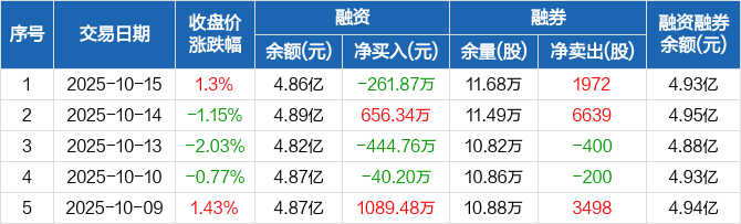 融资方面,当日融资买入1510.01万元,融资偿还1771.87万元,融资净偿还261.87万元。融券方面,融券卖出2955股,融券偿还983股,融券余量11.68万股,融券余额639.29万元。融资融券余额合计4.93亿元。