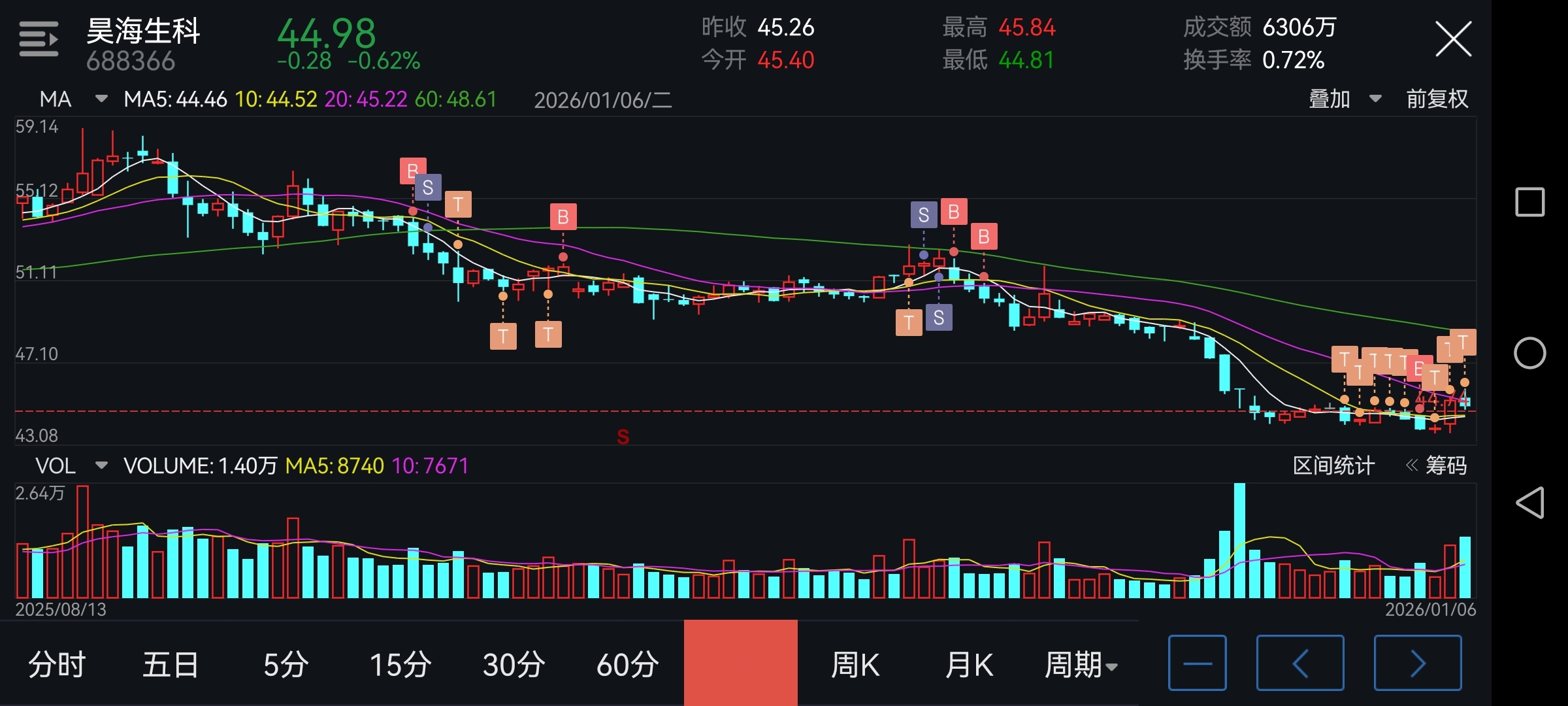 $昊海生科(SH688366)$ 去年9月18日 第一次建仓,成本54元多。买完就一直阴跌,我就跟着每天做T,一直做到今天1月6日,把成本降到44.73,有图为证。主力你有本事继续跌,看我把成本降到30多