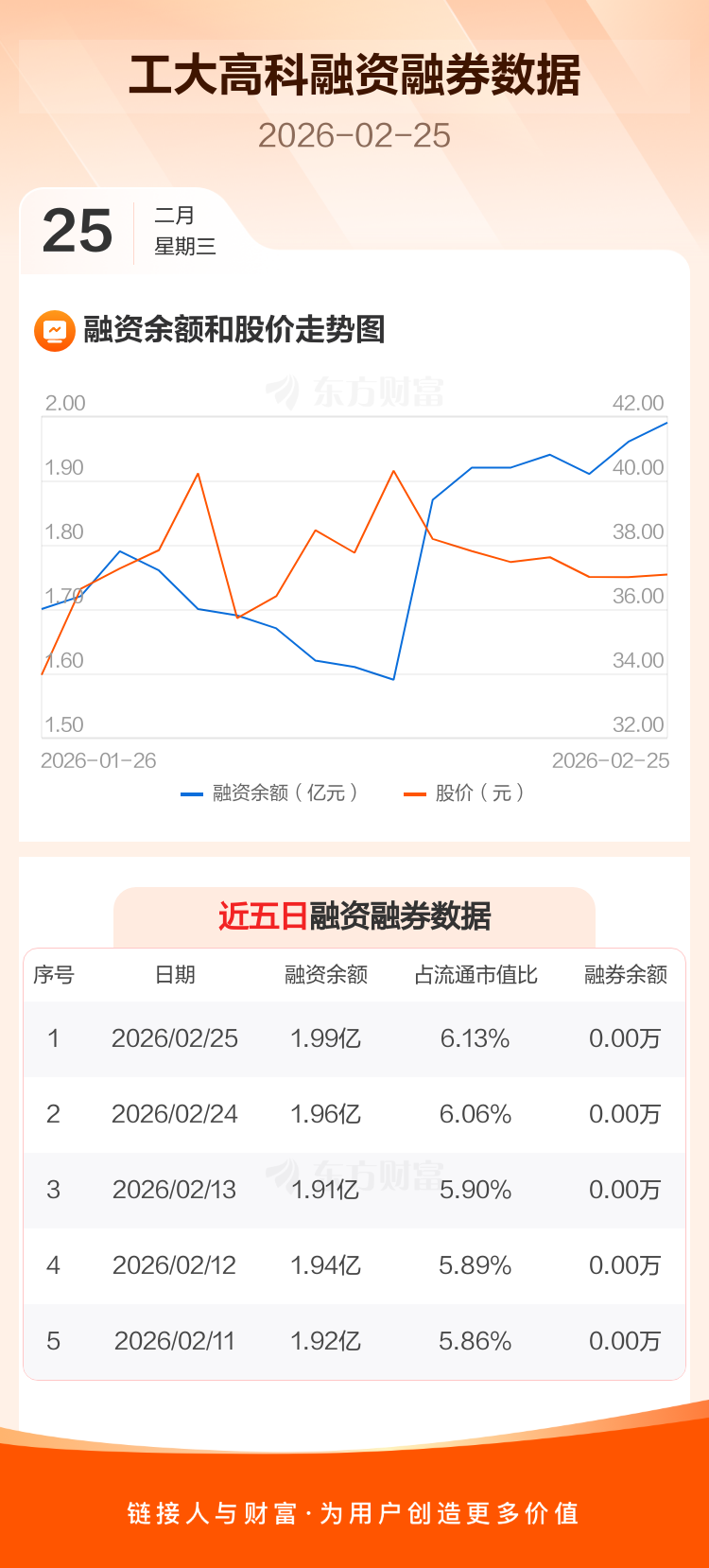交易所最新数据显示,工大高科于2026年2月25日获融资买入1457.00万元,融资偿还1186.68万元,当日融资净买入270.32万元。目前,该股融资余额1.99亿,占流通市值比例为6.13%。
