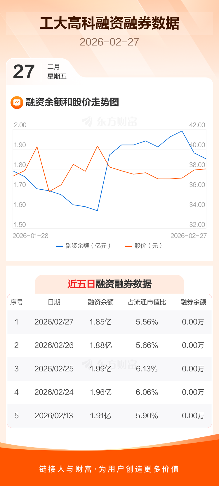 交易所最新数据显示,工大高科于2026年2月27日获融资买入1055.53万元,融资偿还1352.84万元,当日融资净偿还297.3万元。目前,该股融资余额1.85亿,占流通市值比例为5.56%。