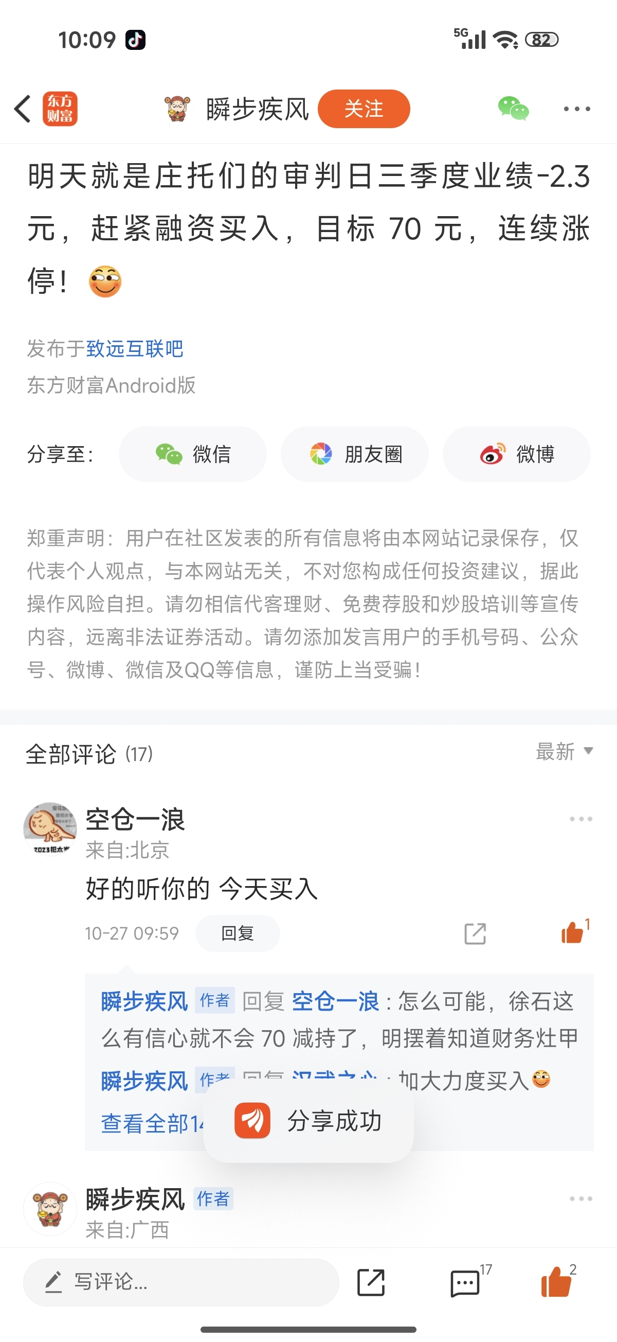 温馨提示: 1.根据《证券法》规定,禁止编造、传播虚假信息或者误导性信息,扰乱证券市场;2.用户在本社区发表的所有资料、言论等仅代表个人观点,与本网站立场无关,不对您构成任何投资建议。用户应基于自己的独立判断,自行决定证券投资并承担相应风险。《东方财富社区管理规定》