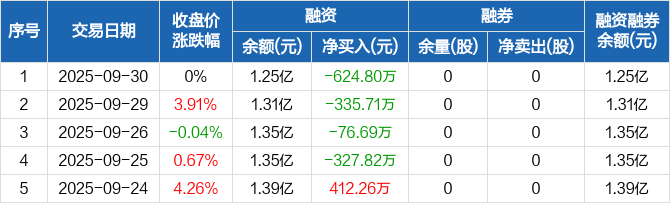融资方面,当日融资买入974.72万元,融资偿还1599.53万元,融资净偿还624.8万元,连续4日净偿还累计1365.03万元。融券方面,融券卖出0股,融券偿还0股,融券余量0股,融券余额0元。融资融券余额合计1.25亿元。