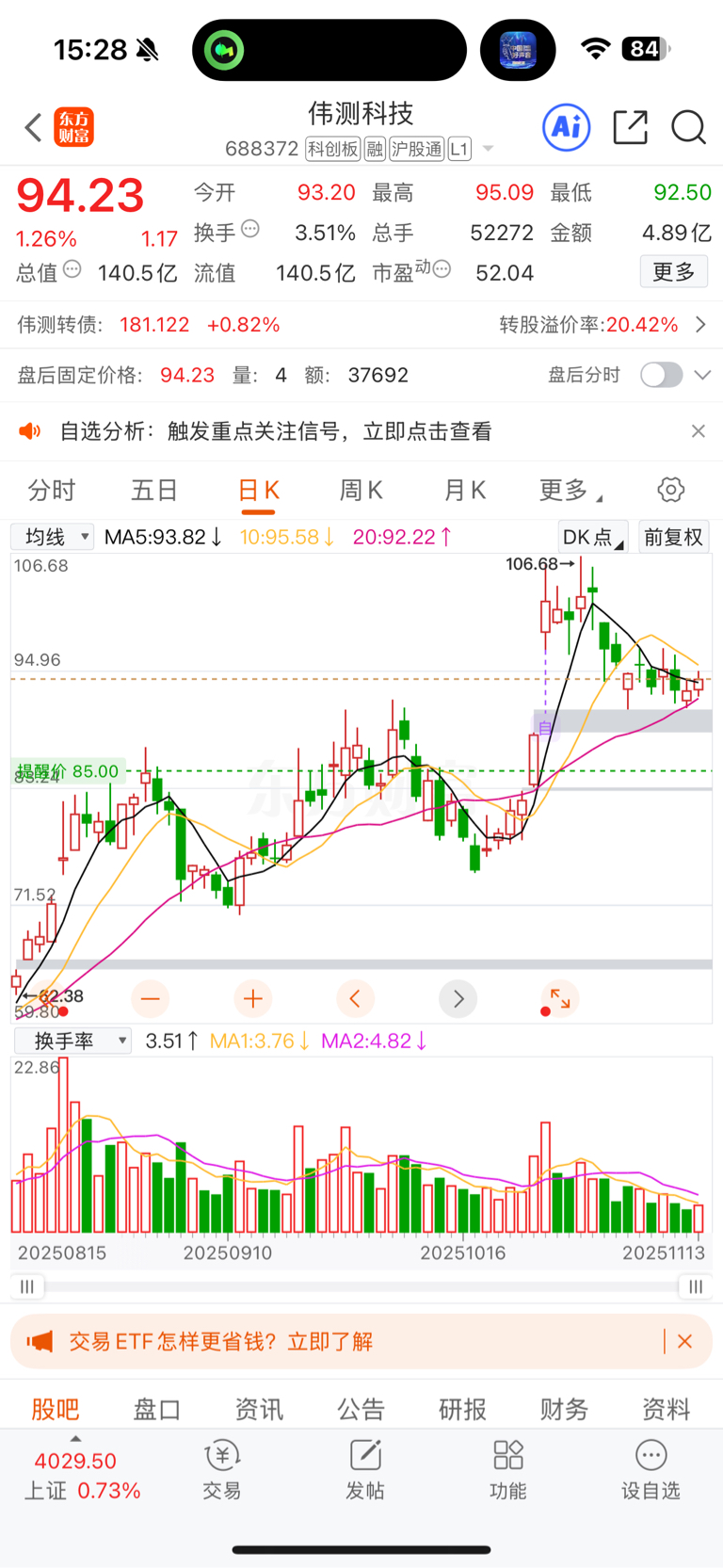 伟侧科技只欠放量一根中大阳线,就可以改变短期均线系统。长期依然多头排列,长期趋势