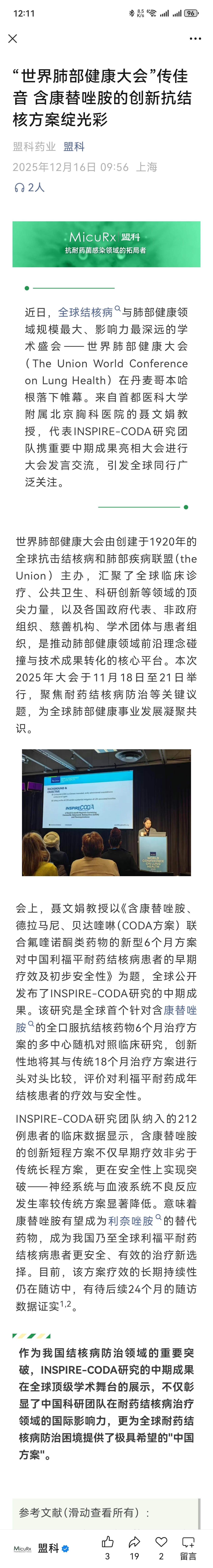 “世界肺部健康大会”传佳音含康替唑胺的创新抗结核方案绽光彩盟科药业盟科2025年