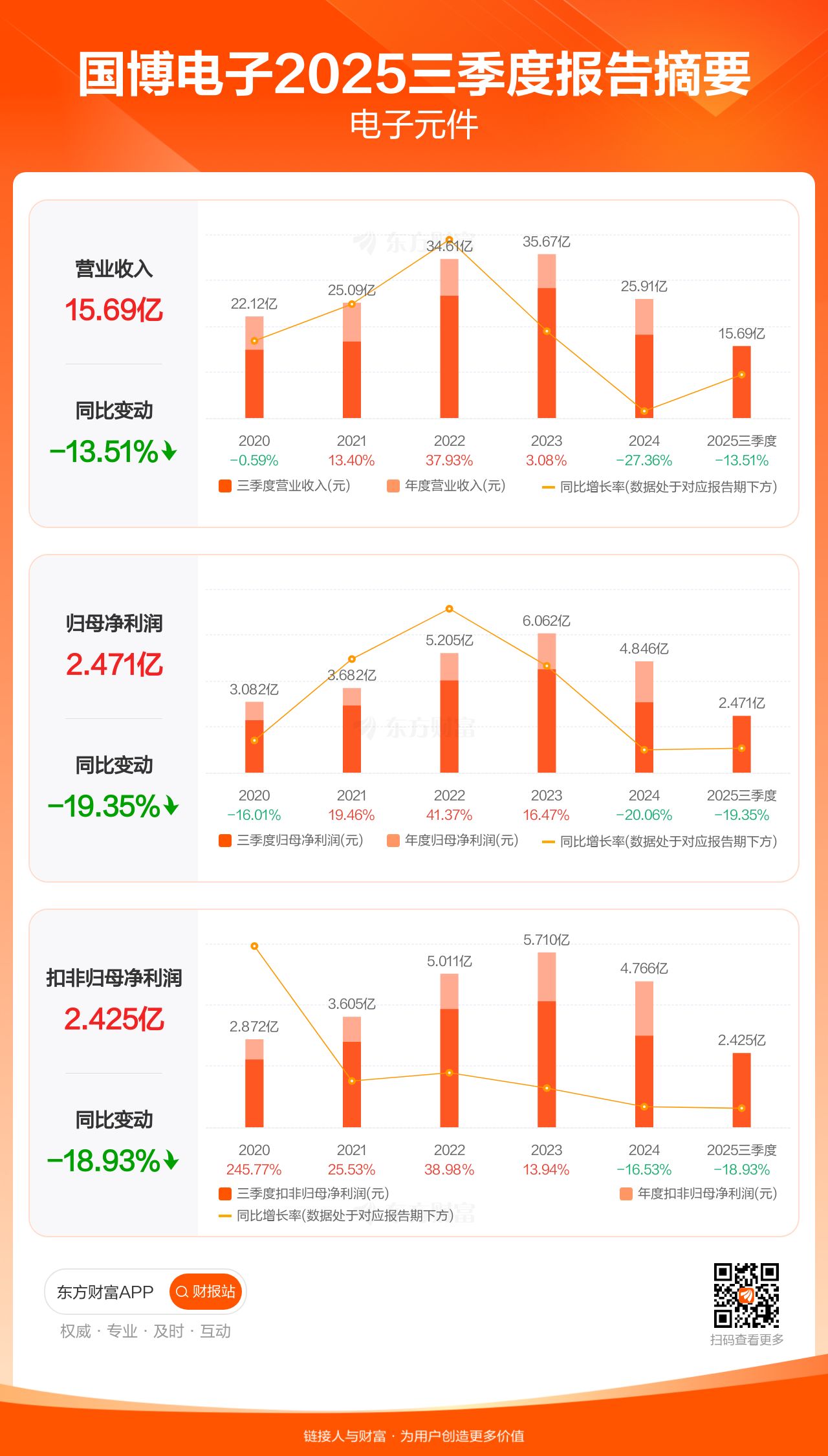 国博电子10月30日发布2025年三季报显示,公司前三季实现营业收入15.69亿元,同比下滑13.51%;归母净利润2.47亿元,同比下滑19.35%;扣非归母净利润2.43亿元,同比下滑18.93%。