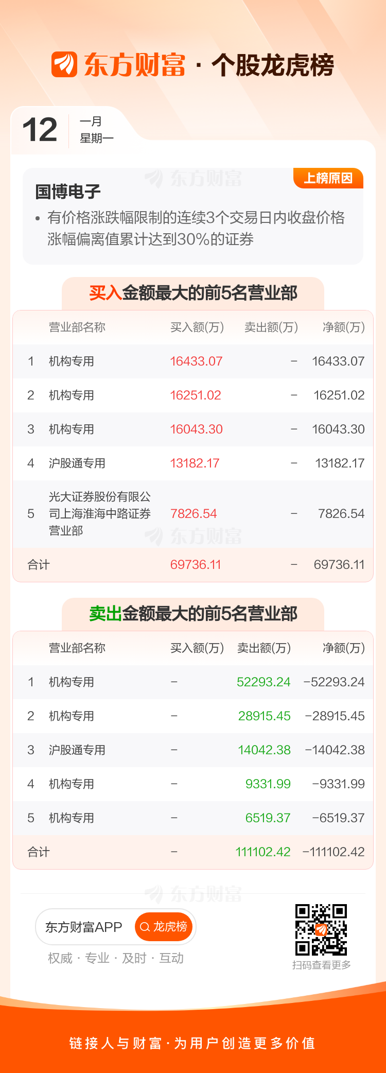 交易所2026年1月12日公布的交易公开信息显示,国博电子因成为有价格涨跌幅限制的连续3个交易日内收盘价格涨幅偏离值累计达到30%的证券上榜。国博电子当日收报155.99元,涨跌幅20.00%,换手率2.55%,成交额22.70亿。异常期间1月9日至1月12日,期间涨幅35.49%,累计偏离值31.60%,区间成交额43.61亿。