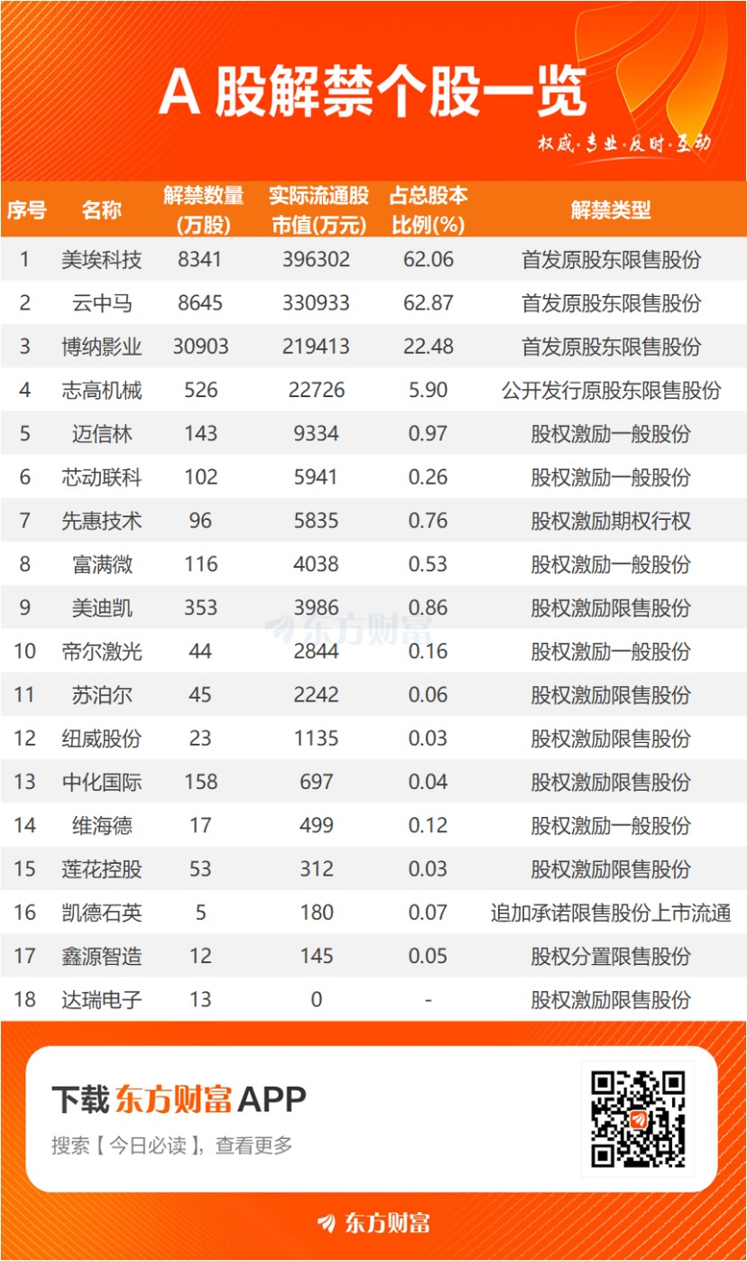 【明日解禁】明日18股解禁 美埃科技、云中马解禁市值居前