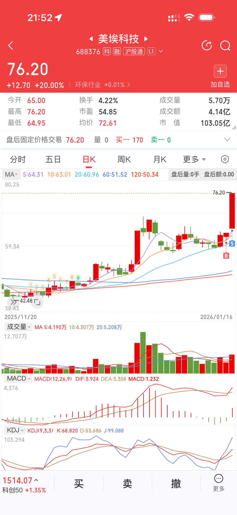 $美埃科技(SH688376)$ 昨天打到5日线的时候进的,今天涨停出了一半,先揣兜里,下周的事再说。
